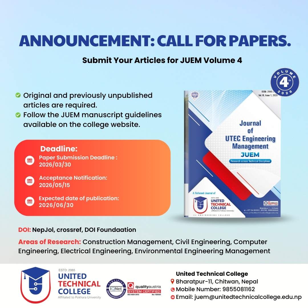Journal of UTEC Engineering Management (JUEM) is an academic, not for profit, blind peer- reviewed journal of research across technical disciplines. It aims to provide teachers, students and learned members of the community an authentic open-access platform featuring scholarly research, reviews and experiments on the state of current discourse on topics of interdisciplinary interest. The annual journal is published both in print and electronic forms once a year on the on the month of June in the English calendar.